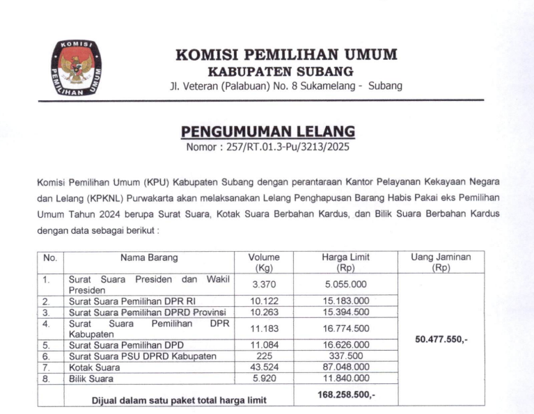 Komisi Pemilihan Umum (KPU) Kabupaten Subang dengan perantaraan Kantor Pelayanan Kekayaan Negara dan Lelang (KPKNL) Purwakarta akan melaksanakan lelang Penghapusan Barang Habis Pakai eks Pemilihan Umum Tahun 2024 berupa Surat Kotak Suara Kardus. dan Bilik Suara Berbahan Kardus dengan data berikut : Pelaksanaan Lelang : Lelang dilaksanakan secara mline melalui situs http://www.lelang.co.id pada Hari : Selasa Tanggal : 16 September 2025 Batas Akhir Penawaran : Pukul 11.00 WIB (Sesuai Waktu server) Alamat domain : https://www.lelang.go.id Tempat lelang : KPKNL Purwakarta Jalan siliwangi No. 9 Purwakarta Penetapan pemenang : Setelah batas akhir penawaran Persyaratan Lelang : Obyek lelang dalarn kondisi apa admya (as is dan site). Peserta lelang dianggap telah mengetahui dan menerima barang tersebut tanpa ada tuntutan apapun. Pendaftaran Peserta lelang dilakukan melalui email davan menggunakan aplikasi lelang internet (ALI) yang dapat di akses melalui alamat situs internet https://www.lelang. go.id dengan mengunggah KTP, NPWP, dan nomor rekening atas nama sendiri. Tata cara mengikuti lelang dapat dilihat pada menu “Prosedur Lelang” dan “Syarat dan Ketentuan” pada alamat situs tersebut. Peserta lelang yang bertindak sebagai kuasa dari badan hukum/badan usaha diwajibkan mengunggah Surat Kuasa dari direksi, akta pendirian perusahaan dan perubahannya, dan NPWP perusahaan dalam 1 (satu) file. Peserta lelang wajib menyetorkan uang jaminan penawaran lelang melalui VA (Virtual Account) dan harus sudah efektif diterima oleh KPKNL Purwakarta selambat-lambatnya satu hari kerja sebelum pelaksanaan lelang dan data identitas telah terverifikasi. Nominal uang jaminan yang disetorkan ke rekening VA (Virtual Account) harus sama dengan nominal uang jaminan yang disyaratkan sesuai Pengumuman Lelang. Segala biaya yang timbul akibat mekanisme perbankan menjadi beban Peserta Lelang Peserta Lelang dapat melihat fisik barang dilaksanakan pada hari Jumat tanggal 12 September 2025 jam 10.00 WIB s.d 16.00 WIB dengan posisi fisik Barang ada di Gudang KPU Kabupaten Subang JI. Palabuan No. 08, Gudang Binawarga Jl. Pandu RT. 09/01 Kel. Sukamelang, Kec. Subang, Gudang Indojaya JI. Brigjen Katamso No. 65 Kel. Dangdeur, Kec. Subang, Gudang Samadhi Jl. Raya Tanjungwangi No. 2 Warungkadu, Desa Tanjungwangi Kec. Cijambe dan Gudang SKB JI. Marsinu No. 1 Kel. Cigadung Subang. Penawaran dilakukan dengan cara "open bidding" (Penawaran terbuka). Setiap Peserta Lelang wajib melakukan penawaran paling sedikit sama dengan Nilai Limit. Pembukaan Penawaran Lelang oleh Pejabat Lelang pada hari Selasa, 16 September 2025 Pukul 11.00 WIB (sesuai waktu server). Pemenang lelang yang ditunjuk wajib melakukan pelunasan harga lelang dan Bea Lelang Pembeli sebesar 2% (dua persen) melalui rekening KPKNL Purwakarta paling lama 5 (lima) hari kerja setelah pelaksanaan lelang Pemenang Lelang yang ditunjuk wajib membuat Surat Pernyataan bermaterai cukup yang menyatakan bersedia menghancurkan surat suara dengan cara dilebur atau didaur ulang dengan disaksikan oleh petugas KPU, sehingga fisik dan informasinya tidak dapat dikenali lagi. Pengambilan barang oleh Pemenang Lelang di KPU Kabupaten Subang paling lambat 3 (tiga) hari kerja setelah pelunasan. Segala biaya yang terkait dengan pengambilan barang menjadi beban dan tanggungjawab Pemenang Lelang Apabila Pemenang Lelang tidak melunasi kewajibannya, maka dinyatakan wanprestasi dan uang jaminan disetorkan ke Kas Negara. Informasi lebih lanjut dapat menghubungi Kantor KPU Kabupaten Subang (Telp. 0260-418084)/ (CP.085294706655) an Aditya Nugraha, SE. atau (CP.085222353686) a.n Tahyudi pada hari dan jam kerja. UNDUH PENGUMUMAN LELANG ....