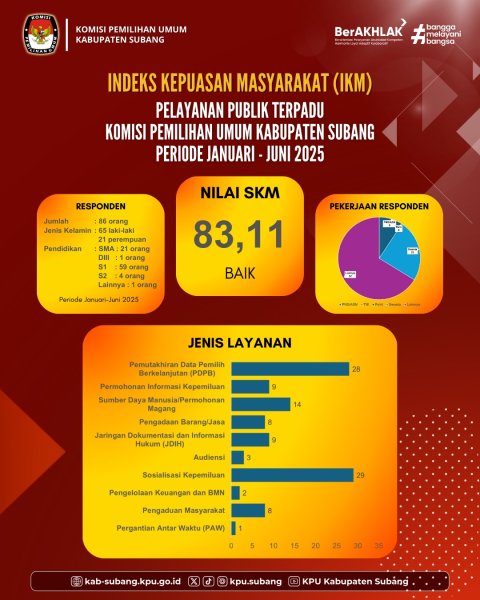 Indek Kepuasan Masyarakat (IKM) KPU Kabupaten Subang mengucapkan terima kasih kepada seluruh masyarakat yang telah berpartisipasi dalam Survei Kepuasan Masyarakat (SKM) atas layanan yang diberikan selama periode Januari hingga Juni 2025. Partisipasi aktif masyarakat ini menjadi dasar yang kuat untuk evaluasi dan perbaikan kualitas pelayanan publik yang lebih baik di masa depan. Berdasarkan hasil survei, tingkat kepuasan masyarakat terhadap pelayanan KPU Kabupaten Subang tercatat berada pada kategori Baik dengan nilai indeks mencapai 83,11. Angka ini menunjukkan bahwa masyarakat merasa puas dengan kualitas layanan yang diberikan, namun kami tetap berkomitmen untuk terus berupaya meningkatkan kualitas dan memastikan bahwa setiap proses pelayanan tetap mengedepankan prinsip transparansi, profesionalisme, dan akuntabilitas. Capaian ini tentu menjadi dorongan bagi KPU Kabupaten Subang untuk terus melakukan perbaikan, baik dalam aspek teknis maupun pelayanan langsung kepada masyarakat. Kami memahami bahwa kepuasan masyarakat adalah cerminan dari kualitas pelayanan publik yang kami berikan. Aspek Layanan & Tindal Lanjut Dari hasil penilaian di atas, kami berkomitmen untuk mendengarkan dan menindaklanjuti setiap masukan yang ada untuk menciptakan pelayanan yang semakin optimal. KPU Kabupaten Subang juga mengajak seluruh lapisan masyarakat untuk terus memberikan masukan yang konstruktif agar kami dapat terus berinovasi dan beradaptasi dengan kebutuhan serta harapan masyarakat, sehingga tercipta pelayanan yang lebih transparan, cepat, dan akuntabel. Terima kasih atas kepercayaan yang diberikan, dan kami akan terus berusaha memberikan yang terbaik untuk masyarakat Subang. ....