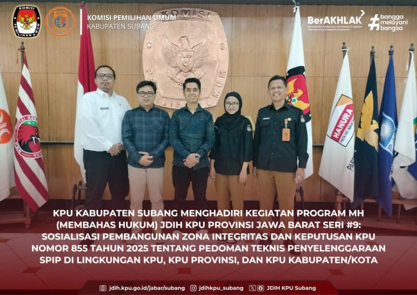 Bandung - Komisi Pemilihan Umum (KPU) Provinsi Jawa Barat kembali menyelenggarakan kegiatan Program Membahas Hukum Seri #9 dengan mengangkat topik “Sosialisasi Pembangunan Zona Integritas dan Keputusan KPU Nomor 855 Tahun 2025 tentang Pedoman Teknis Penyelenggaraan SPIP di Lingkungan KPU, KPU Provinsi, dan KPU Kabupaten/Kota.” Kegiatan ini merupakan bagian dari rangkaian program Jaringan Dokumentasi dan Informasi Hukum (JDIH) KPU Provinsi Jawa Barat dalam rangka memperkuat konsolidasi kelembagaan serta mendorong terwujudnya tata kelola pemerintahan yang transparan dan berintegritas di lingkungan KPU. Dari KPU Kabupaten Subang, hadir secara langsung Kadiv Hukum dan Pengawasan Bapak Ricky Permana, Kadiv Sosialisasi, Pendidikan Pemilih, Partisipasi Masyarakat, dan SDM Bapak M. Ilham Ramadhan, Plt Sekretaris Bapak Brevo Yant Hadiansyah, serta operator SPIP Ibu Herty Anggraeni dan Yanuar Caprio. Melalui kegiatan ini, para peserta mendapatkan pemahaman mendalam mengenai sinergitas antara KPU Provinsi Jawa Barat dengan Aparat Penegak Hukum dalam pelaksanaan tugas kepemiluan, sekaligus berbagi pengalaman pembangunan zona integritas. Narasumber utama dari Kejaksaan Tinggi Jawa Barat, Ibu Dr. Anabertha Sembiring, S.H., M.H., turut memberikan paparan mengenai pentingnya sinergi kelembagaan dan integritas dalam pelaksanaan tugas publik. Selain itu, Ibu Gusni Yulianti dan Ibu Tina Christaning dari Inspektorat Utama Sekretariat Jenderal KPU RI menyampaikan materi mengenai tata cara penyusunan kartu kendali dan dokumen pendukung SPIP, sebagai upaya memperkuat sistem pengendalian internal di setiap satuan kerja. Turut hadir Anggota KPU RI, Ibu Iffa Rosita, yang dalam arahannya menegaskan pentingnya membangun budaya kerja berintegritas di lingkungan KPU. Beliau menekankan bahwa pengendalian internal bukan sekadar kewajiban administratif, tetapi harus menjadi bagian dari nilai dan perilaku kerja seluruh pegawai KPU. Senada dengan hal tersebut, Kadiv SDM dan Litbang KPU Provinsi Jawa Barat, Bapak Abdullah Sapi’i, menegaskan pentingnya seluruh pegawai memahami budaya kerja, tata laksana, dan struktur organisasi sebagai pondasi profesionalisme kelembagaan. Sementara itu, Kadiv Hukum dan Pengawasan KPU Provinsi Jawa Barat, Ibu Aneu Nursifah, berpesan agar seluruh jajaran KPU mulai mengimplementasikan pembangunan zona integritas secara nyata. Ia menekankan bahwa substansi SPIP bukan hanya sebagai laporan administratif, tetapi harus diwujudkan menjadi budaya kerja yang melekat dalam setiap kegiatan dan satuan kerja di seluruh jajaran KPU Jawa Barat. Melalui kegiatan ini, diharapkan seluruh jajaran KPU, baik di tingkat provinsi maupun kabupaten/kota, semakin memperkuat komitmen terhadap integritas, profesionalitas, dan akuntabilitas dalam menjalankan tugas penyelenggaraan pemilu yang berintegritas dan berkeadilan. ....