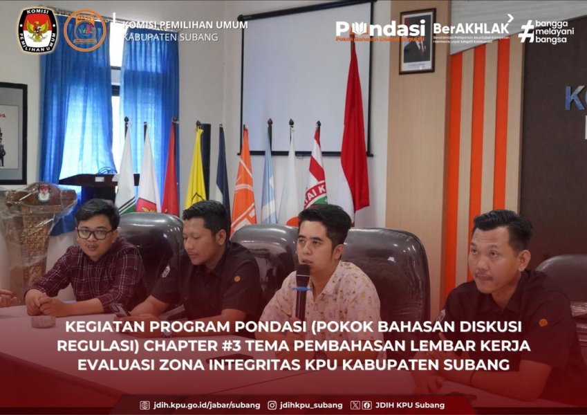 Subang — Komisi Pemilihan Umum (KPU) Kabupaten Subang kembali menyelenggarakan kegiatan Pokok Bahasan Diskusi Regulasi (PONDASI) Chapter 3, dengan tema “Pembahasan dan Pelaksanaan Lembar Kerja Evaluasi Zona Integritas.” Kegiatan ini merupakan bagian dari upaya berkelanjutan KPU Kabupaten Subang dalam memperkuat pemahaman regulasi internal dan mendorong terwujudnya tata kelola kelembagaan yang berintegritas. PONDASI Chapter 3 ini digagas oleh Divisi Rendatin (Perencanaan, Data, dan Informasi) sebagai ruang diskusi bersama untuk menyamakan persepsi dan langkah dalam pelaksanaan program Zona Integritas (ZI) di lingkungan KPU Kabupaten Subang. Kegiatan ini dihadiri oleh seluruh Anggota KPU Kabupaten Subang, Plt. Sekretaris, seluruh Kepala Subbagian (Kasubbag), serta seluruh staf KPU Kabupaten Subang. Melalui kegiatan ini, peserta bersama-sama membahas mekanisme penyusunan dan pengisian Lembar Kerja Evaluasi Zona Integritas, yang menjadi instrumen penting dalam mengukur sejauh mana implementasi nilai-nilai integritas, akuntabilitas, dan transparansi telah diterapkan di setiap bagian kerja. KPU Kabupaten Subang berharap kegiatan PONDASI ini dapat menjadi wadah pembelajaran internal yang berkesinambungan serta mendorong semangat seluruh jajaran untuk terus menguatkan budaya kerja yang berorientasi pada pelayanan publik yang bersih, profesional, dan berintegritas. ....
