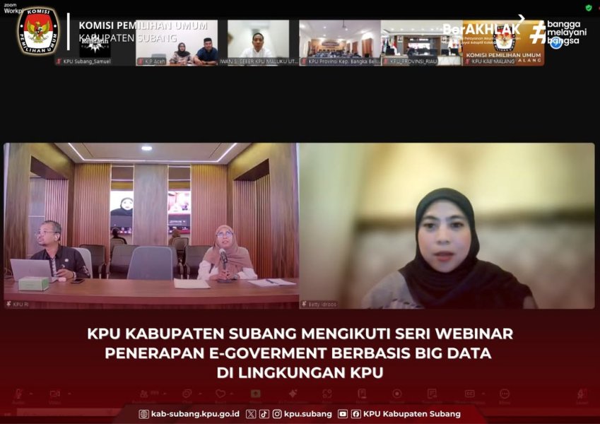 Subang — Komisi Pemilihan Umum (KPU) Kabupaten Subang mengikuti Seri Webinar Penerapan E-Government Berbasis Big Data di Lingkungan KPU yang diselenggarakan secara daring melalui aplikasi Zoom Meeting pada Jumat, 7 Oktober 2025. Kegiatan ini merupakan bagian dari upaya KPU RI dalam memperkuat transformasi digital di lingkungan penyelenggara pemilu, khususnya dalam mendukung pengelolaan data dan informasi yang terintegrasi, efisien, serta berbasis teknologi modern. Hadir dalam kegiatan tersebut, Ketua KPU Kabupaten Subang, Bapak Abdul Muhyi, Kadiv Hukum dan Pengawasan, Bapak Ricky Permana, Kadiv Perencanaan, Data, dan Informasi, Bapak Suhenda, Kasubbag Perencanaan, Data, dan Informasi, Bapak Tigor Samuel, serta staf Subbag Perencanaan, Data, dan Informasi, Bapak Taupik Hidayat dan Bapak Dadan Nurmaulana. Melalui kegiatan ini, peserta mendapatkan pemahaman mendalam mengenai strategi penerapan E-Government berbasis Big Data yang dapat memperkuat sistem informasi, mempercepat pengambilan keputusan berbasis data, serta meningkatkan transparansi dan akuntabilitas dalam penyelenggaraan pemilu. KPU Kabupaten Subang berkomitmen untuk terus mendukung program digitalisasi kelembagaan yang diinisiasi oleh KPU RI, guna mewujudkan penyelenggaraan pemilu yang lebih modern, efisien, dan berintegritas. ....
