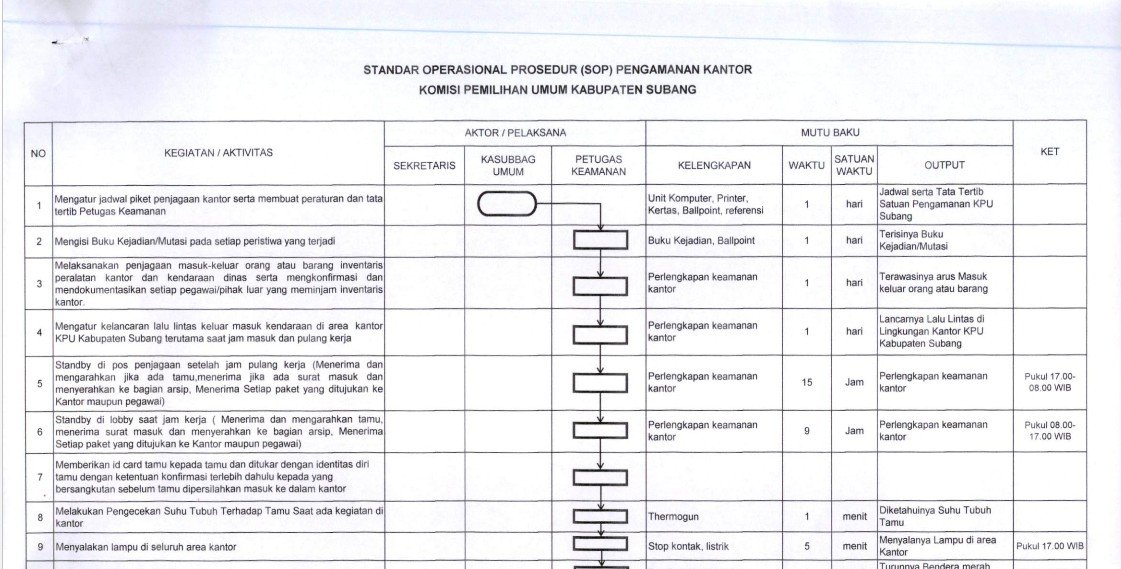 Standar Operasional Prosedur (SOP) Pramubakti KPU Kabupaten Subang adalah pedoman kerja yang mengatur tata cara, tugas, dan tanggung jawab tenaga pramubakti dalam mendukung kelancaran kegiatan operasional kantor. Dokumen ini disusun untuk memastikan setiap layanan yang diberikan berjalan tertib, rapi, dan sesuai dengan standar pelayanan kelembagaan. SOP Pramubakti memuat ketentuan mengenai tugas harian, seperti menjaga kebersihan lingkungan kerja, menata ruang rapat, membantu kebutuhan logistik kegiatan, serta mendukung kelancaran pelayanan publik di kantor KPU Subang. Selain itu, SOP ini juga mengatur sikap kerja pramubakti agar selalu disiplin, sigap, sopan, dan menjaga kerahasiaan informasi kelembagaan. Dengan adanya SOP Pramubakti, KPU Kabupaten Subang menjamin tersedianya layanan pendukung yang profesional, sehingga lingkungan kerja tetap nyaman, kegiatan kelembagaan berjalan lancar, dan pelayanan publik dapat diberikan secara optimal. UNDUH DOKUMEN