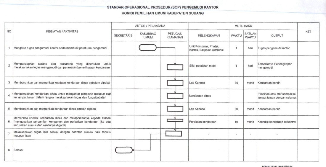 Standar Operasional Prosedur (SOP) Pengemudi KPU Kabupaten Subang merupakan pedoman resmi yang mengatur tata cara, tanggung jawab, serta standar kerja pengemudi dalam melaksanakan tugas kedinasan. SOP ini disusun untuk memastikan bahwa setiap aktivitas transportasi, baik untuk kebutuhan operasional sehari-hari, perjalanan dinas, maupun distribusi logistik Pemilu, berjalan dengan aman, tertib, dan sesuai ketentuan. Melalui SOP Pengemudi, ditetapkan prosedur pemeriksaan kendaraan sebelum dan sesudah digunakan, tata cara berkendara yang mengutamakan keselamatan, serta kewajiban menjaga kebersihan dan perawatan kendaraan dinas. Selain itu, SOP ini juga mengatur larangan penggunaan kendaraan untuk kepentingan pribadi dan menekankan pentingnya disiplin serta profesionalitas pengemudi. Dengan adanya SOP Pengemudi, KPU Kabupaten Subang menegaskan komitmen untuk mendukung kelancaran tugas kelembagaan, menjaga keamanan dan keselamatan penumpang maupun logistik, serta memberikan pelayanan transportasi yang tertib, efektif, dan dapat dipertanggungjawabkan. UNDUH DOKUMEN