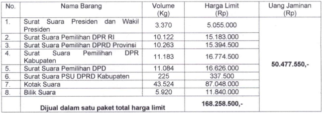 Komisi Pemilihan Umum (KPU) Kabupaten Subang dengan perantaraan Kantor Pelayanan Kekayaan Negara dan Lelang (KPKNL) Purwakarta akan melaksanakan lelang Penghapusan Barang Habis Pakai eks Pemilihan Umum Tahun 2024 berupa Surat Kotak Suara Kardus. dan Bilik Suara Berbahan Kardus dengan data berikut :