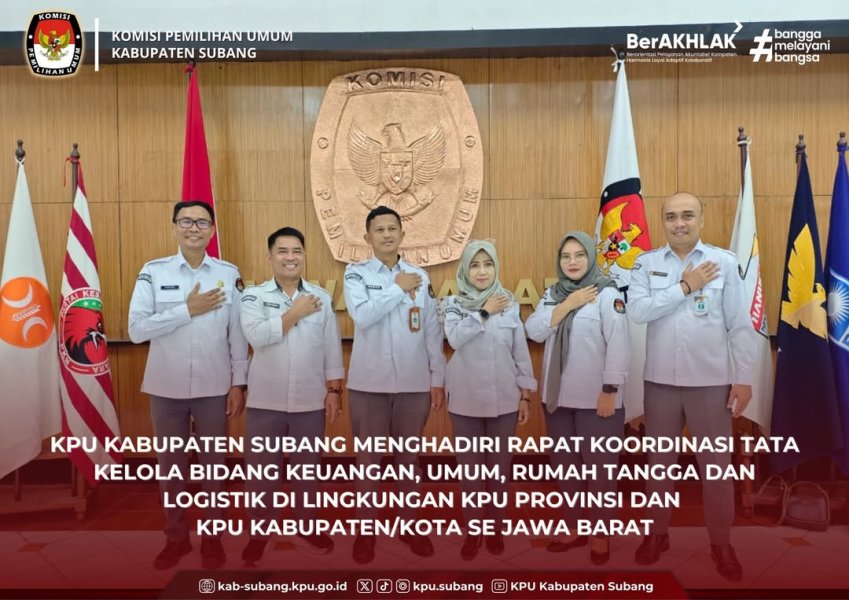 Bandung - KPU Kabupaten Subang menghadiri Rapat Koordinasi Tata Kelola Bidang Keuangan, Umum, Rumah Tangga, dan Logistik di Lingkungan KPU Provinsi dan KPU Kabupaten/Kota se-Jawa Barat pada Kamis, 23 Oktober 2025, bertempat di Aula Setia Permana, KPU Provinsi Jawa Barat, Kota Bandung.