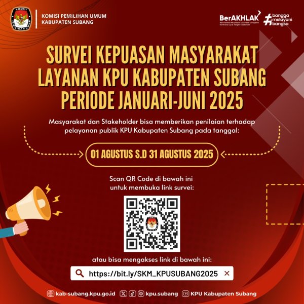 Sekretariat KPU Kabupaten Subang mengajak seluruh masyarakat yang telah menerima layanan untuk berpartisipasi aktif dalam mengisi Survei Kepuasan Masyarakat.