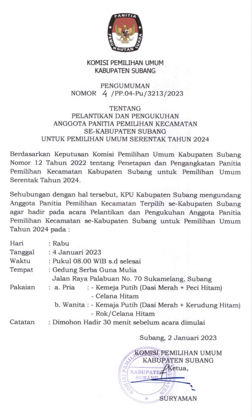 Pengumuman Pelantikan dan Pengukuhan Calon Anggota PPK Terpilih se-Kabupaten Subang untuk Pemilu Tahun 2024