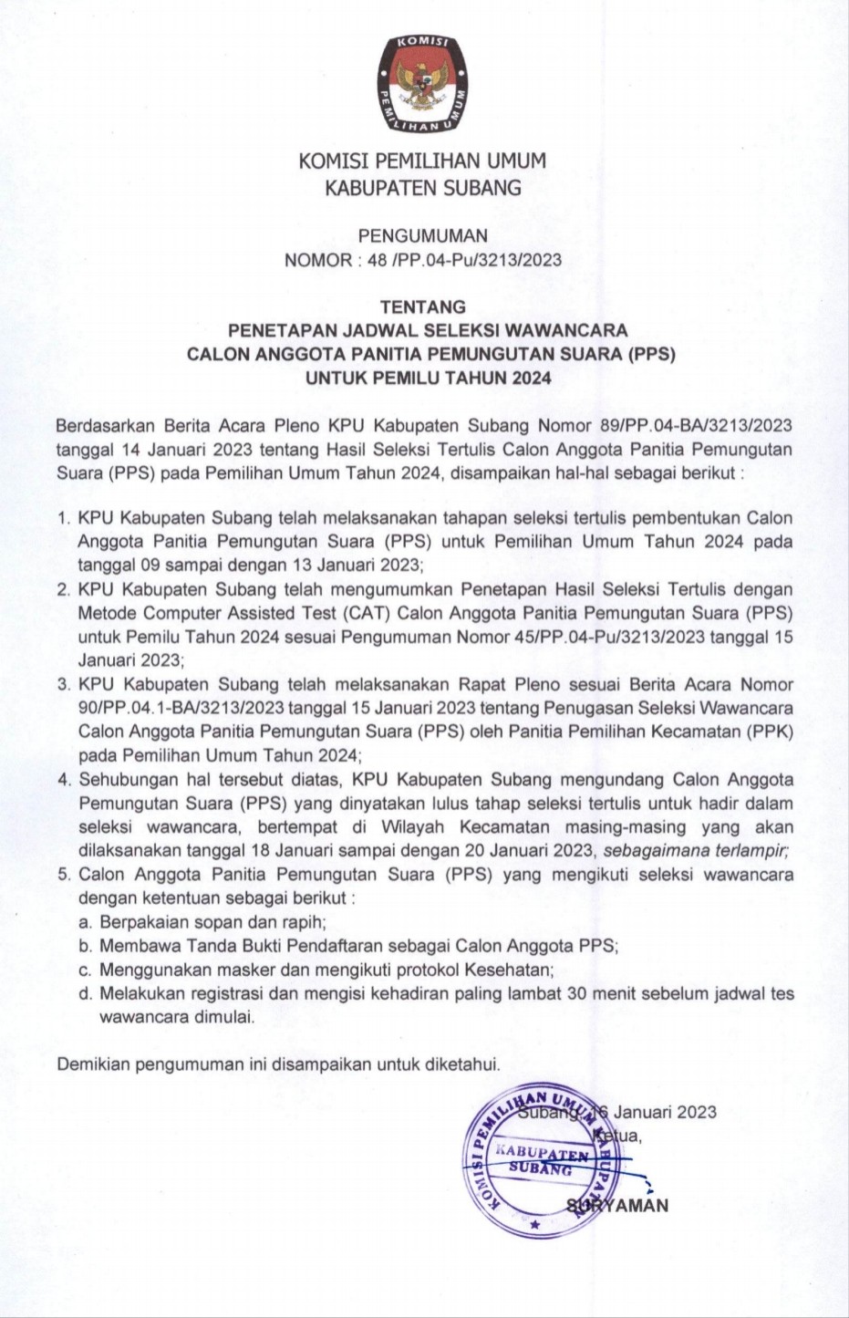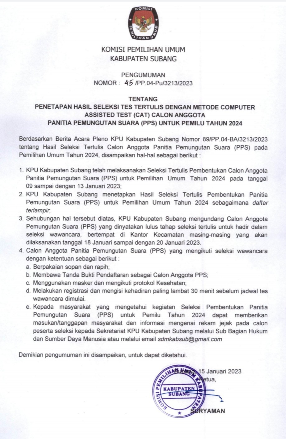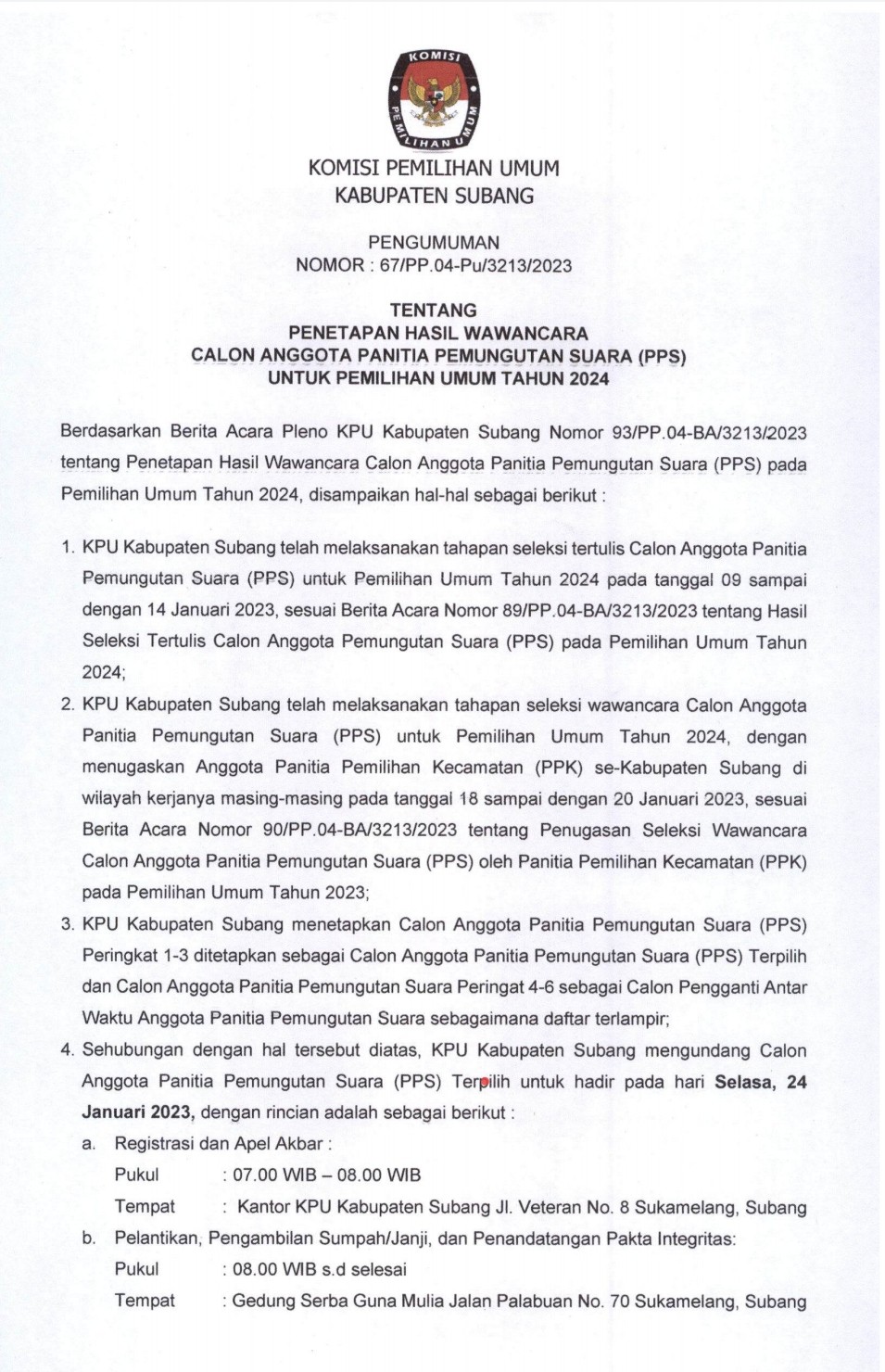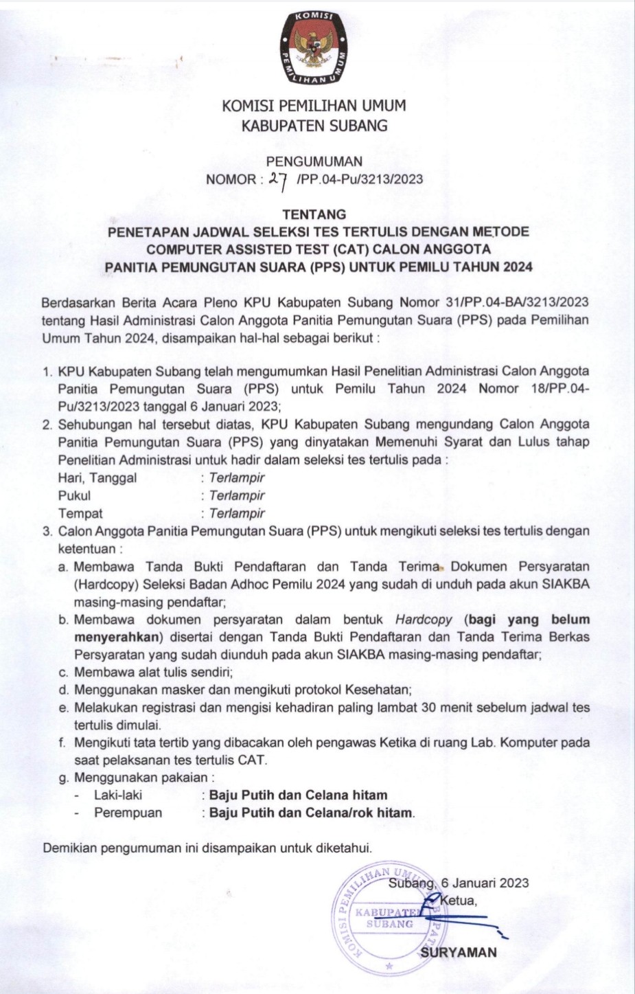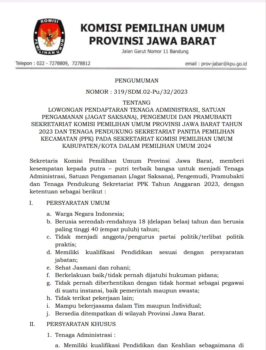 PENGUMUMAN KPU PROVINSI JAWA BARAT NOMOR 319/SDM.02-Pu/32/2023 TENTANG LOWONGAN PENDAFTARAN TENAGA ADMINISTRASI, SATUAN PENGAMANAN (JAGAT SAKSANA), PENGEMUDI DAN PRAMUBAKTI SEKRETARIAT KOMISI PEMILIHAN UMUM PROVINSI JAWA BARAT TAHUN 2023 DAN TENAGA PENDUKUNG SEKRETARIAT PANITIA PEMILIHAN KECAMATAN (PPK) PADA SEKRETARIAT KOMISI PEMILIHAN UMUM KABUPATEN/KOTA DALAM PEMILIHAN UMUM 2024